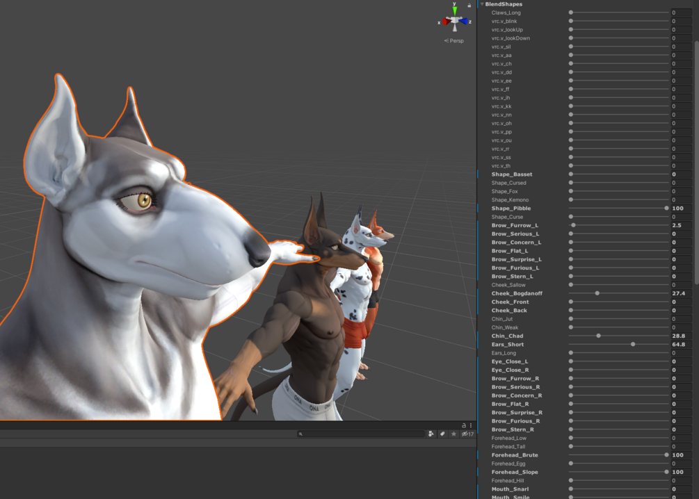 The Hymir Hound is an extremely customizeable all-purpose canine avatar, and has a myriad of facial blendshapes and bones, allowing it to be molded into most large dog breed bone structures. This includes blendshapes for individual face segments (Muzzle, cheek, chin, jaw, forehead, eyebrows, etc), as well as full face overrides for more complex restructures.